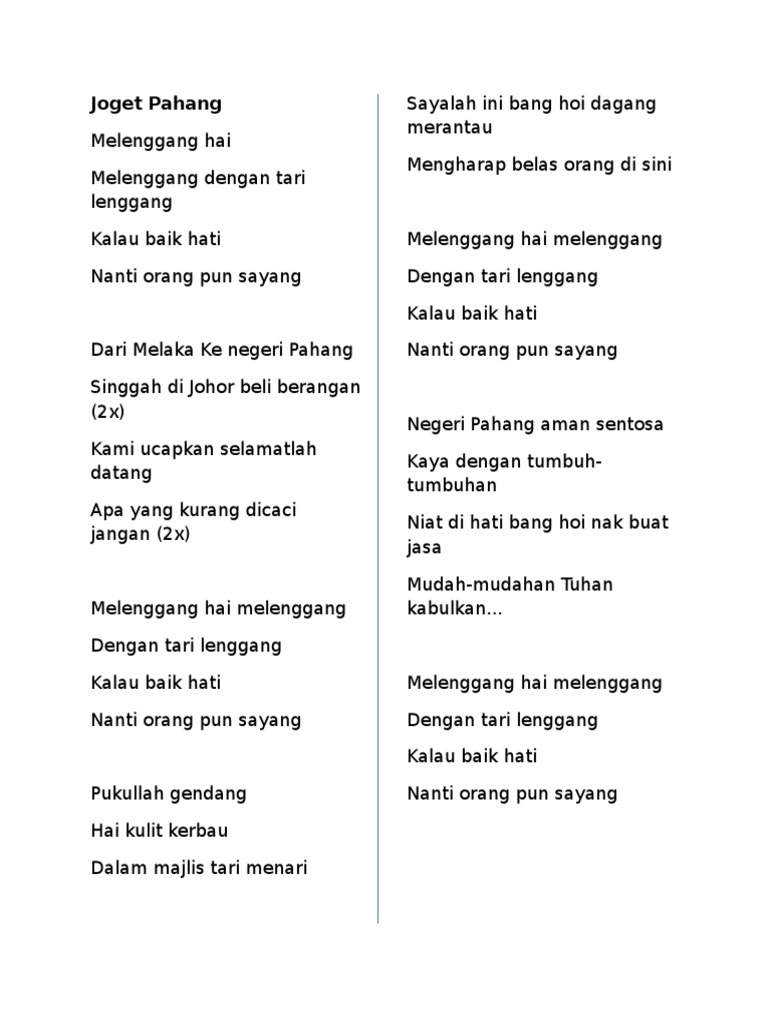 Joget Pahang-Lyrics-Melenggang haiMelenggang dengan tari lenggang Kalau baik hati Nanti orang pun sayang Dari Melaka pergi ke Pahang. Dalam lirik lagu Joget Pahang lagu yang diciptakan P Ramlee dan lirik ditulis arwah bapa saya mereka tanya ada satu baris yang menyebut. About Press Copyright Contact us Creators Advertise Developers Terms Privacy Policy Safety How YouTube works Test new features Press Copyright Contact us Creators.